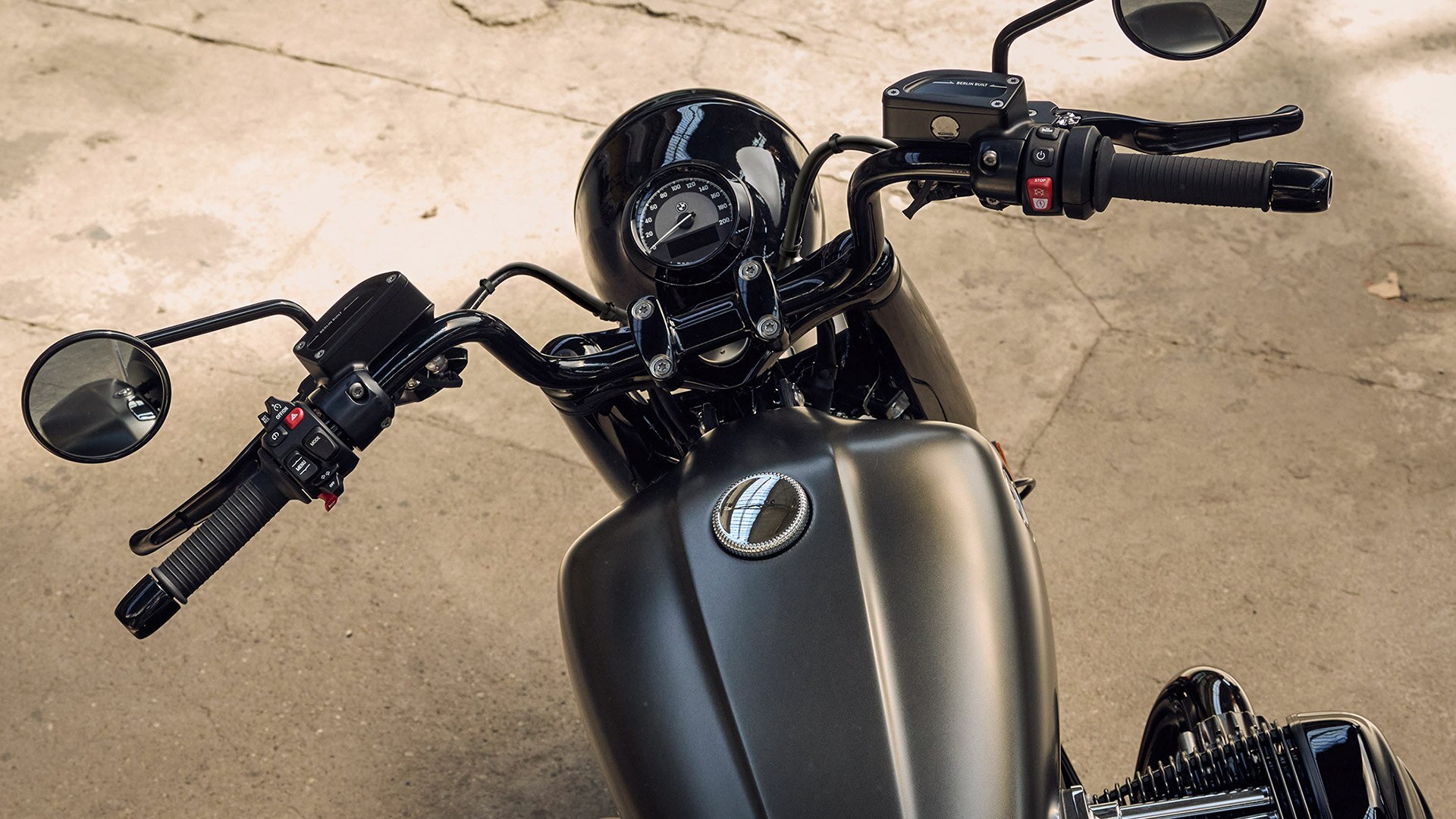 El icónico frontal, con faros LED redondos y llantas de fundición de aluminio de 21 pulgadas, señala el camino hacia el horizonte. Pon tus manos tranquilamente en el Apehanger midi y coloca los pies en los estribos de serie, mientras el asiento dragster te ofrece una sujeción perfecta para trayectos largos. La silueta alargada bagger encaja perfectamente con la parte de atrás que marca el estilo con las maletas de carcasa rígida.  Esta moto es inconfundible. Inconfundible: el sonido único del Boxer que sale del llamativo silenciador final de color cromo oscuro.